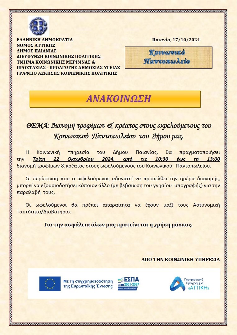 Διανομή τροφίμων & κρέατος στους ωφελούμενους του Κοινωνικού Παντοπωλείου του Δήμου μας - Οκτώβριος 2024