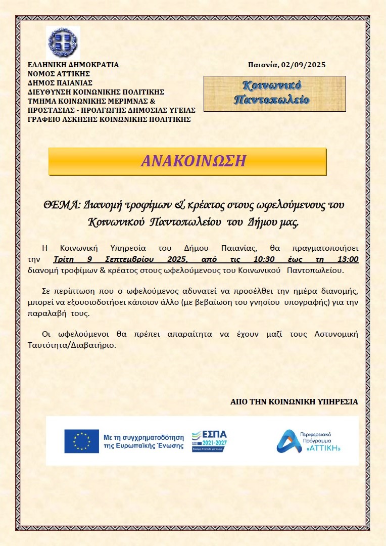 Διανομή τροφίμων στους ωφελούμενους του Κοινωνικού Παντοπωλείου του Δήμου μας - Σεπτέμβριος 2025